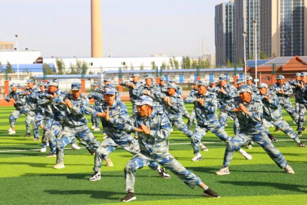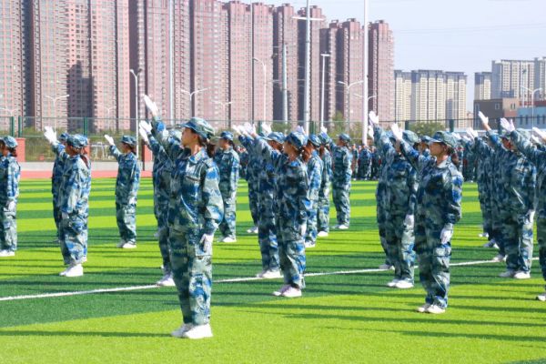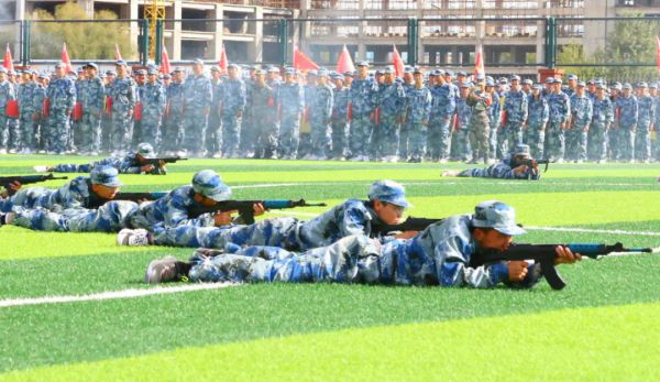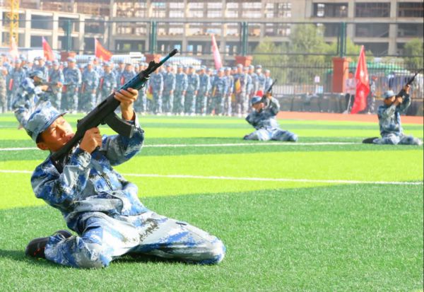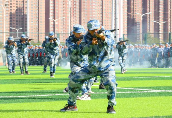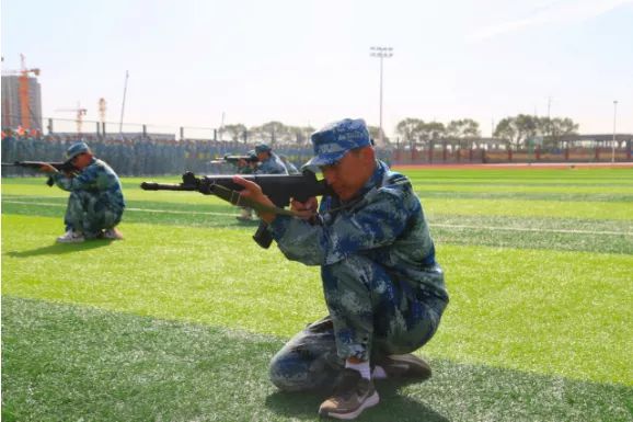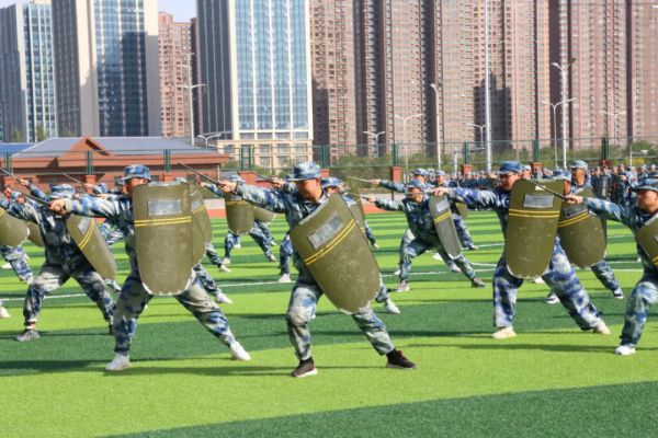 随后,同学们进行了精彩纷呈的军训成果汇报表演。手语操整齐划一,饱含爱国深情;防暴盾牌操势如破竹,气势如虹,训得是强健体魄;军体拳虎虎生威,坚定不移,练得是坚韧品格。射击战术演练模拟实战场景,干练霸气,冲锋行进、翻滚卧倒、跪姿射击、匍匐前进、密切配合、应急救护……一气呵成,硬核超燃!尽显绿茵豪情和赫赫军威,赢得了在场领导和观众的热烈掌声。