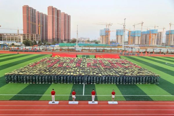 巨幅党旗和国旗在阳光下鲜艳舒展,2000余名新生组成的表演方阵用创意拼字展示训练成果,“1921-2021”“100”“1949-2021”“请党放心 强国有我”等字样变换出现,表达出创院学子对党和祖国的热爱和肩负时代使命的青春担当!