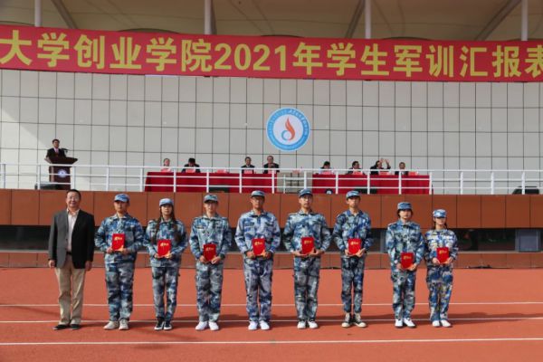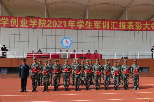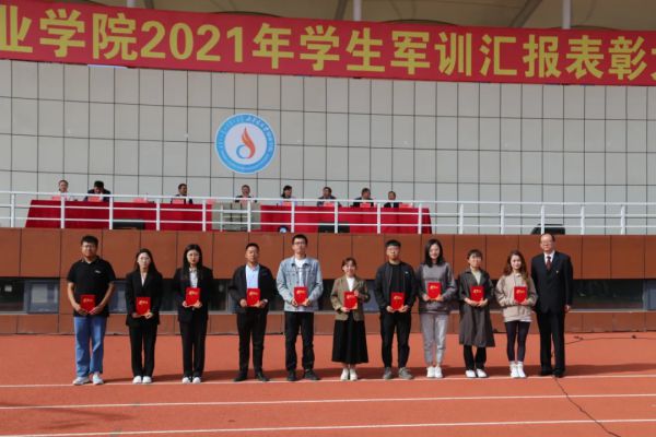 学院团委书记、学生工作部部长姚雯欣宣读《伟德BV1946官网2021年学生军训评比表彰决定》。177名军事训练标兵、6个“请党放心,强国有我”红歌赛优秀连队、8个内务卫生先进连队、21名优秀教官、10名优秀指导员、8个军事训练先进连队受到表彰。与会领导为获奖的集体和个人颁奖。