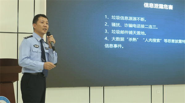 牛腾飞队长为在座师生作网络安全知识科普。他围绕当下网络安全形势、网络安全法等内容,以案释法、以法论事,对电信诈骗、非法集资等常见违法行为进行讲解。牛腾飞强调电信诈骗的严肃性和危害性,引导师生培养健康文明的安全上网意识,提高自身安全反诈意识。牛腾飞表示:“要让绿色上网、文明上网、安全上网的理念深入人心,有效落实网络安全宣传教育,筑牢网络安全的防火墙。”
