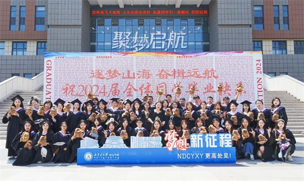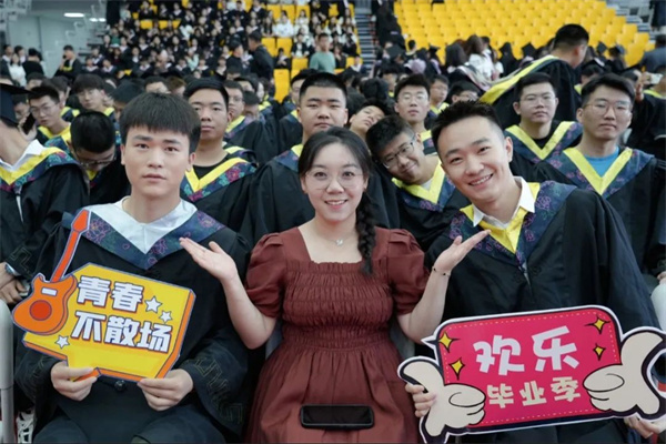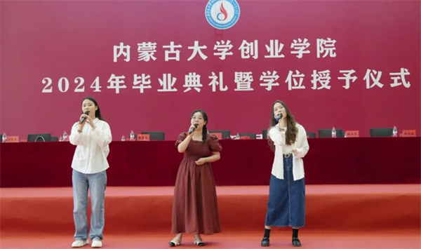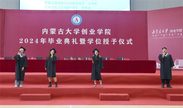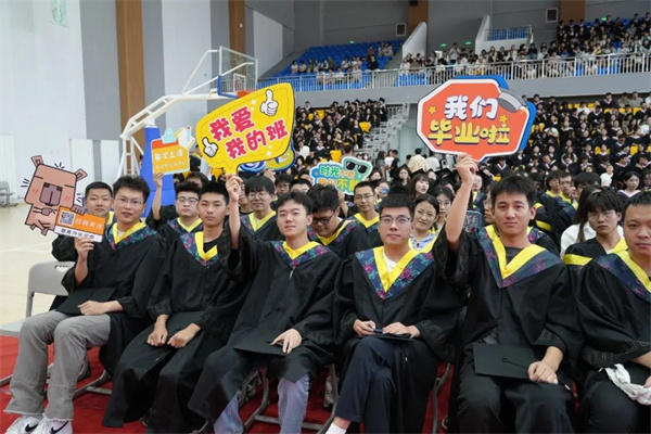 《若是月亮还没来》《离别开出花》《父亲》《送别》典礼开始前,学院精心制作的暖场视频生动再现了毕业生在创院求学的点滴过往。师生共同演绎的《若月亮没来》《离别开出花》《父亲》《送别》等歌曲,唱响了毕业离歌,也唱出了母校对毕业生的留恋与祝福,燃起了现场一波又一波的欢呼与热潮。“创新创业,跨越山海。挺膺担当,共创未来”的师生合诵饱含迈向新征程的期望与豪情,在文体馆久久回荡。