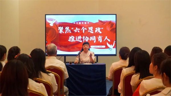 在思政课堂,学院党委副书记、纪委书记张莉同志为同志们讲授了题为《聚焦“六个思政” 推进协同育人》的专题党课。她围绕学生思政、教师思政、课程思政、专业思政、队伍思政、文化思政六个方面的具体思路和做法,引导教师党员要牢记“为党育人 为国育才”的初心使命,充分发挥先锋模范作用,做精于“传道授业解惑”的“经师”和“人师”的统一者,不断促进知识教育、专业教育与思政育人的充分融合,为中华民族伟大复兴培养德智体美劳全面发展的社会主义建设者和接班人。